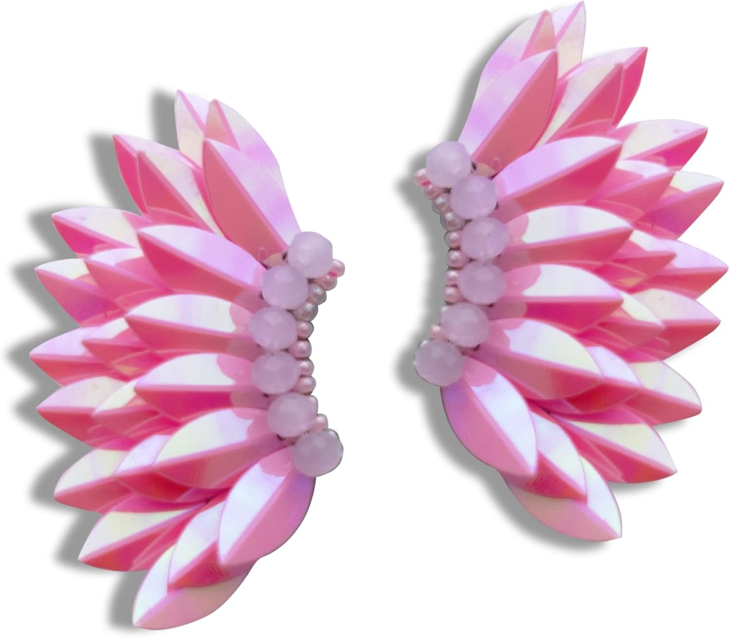 Four layers of chunky mirrored leaf shaped sequins, Two layers of beading, Gold colored stem, hand cut comfort white back, crescent shape, 1” x 1.5”