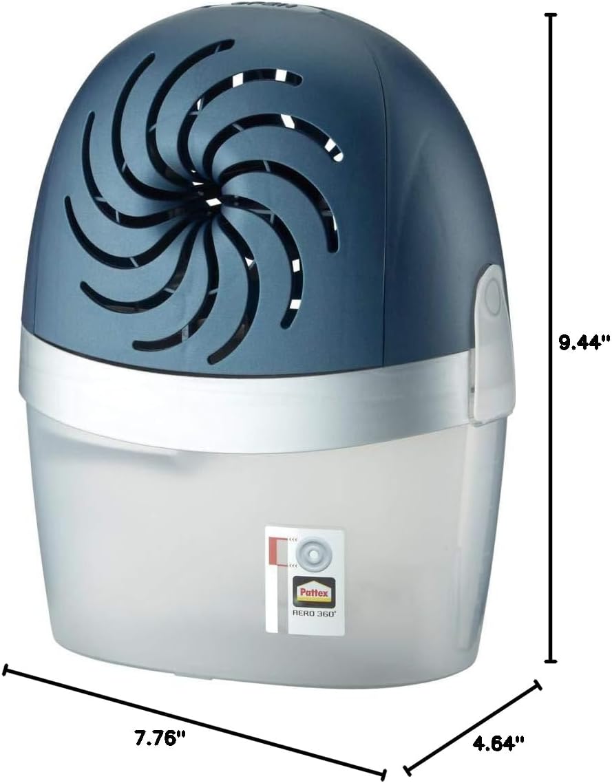 Avoid excess moisture in the house and create a good indoor climate - with the Pattex AERO 360º dehumidifier Simply reduce excess moisture at home: Thanks to its 360 ° air circulation, the AERO 360 ° dehumidifier and odor neutralizer effectively absorbs moisture and thus contributes to a pleasant room climate. The dehumidifier prevents common moisture problems such as condensation, mold and musty smells. The AERO 360 ° tab consists of active crystals and its patented wave-shaped surface improves air exposure and circulation. In addition, the tab contains patented anti-odor agents that capture and neutralize bad odors. The Pattex Air dryer also indicates when a refill is required and ensures non-stop humidity control. It consists of 60% recycled plastic. Application: 1. Press the 'OPEN' button on top of the device. 2. The packaging of the Pattex Open the dehumidifier with the refill tab. 3. Place the tab on the axis with the blue side down and close the device. 4. As soon as the water in the tank has reached the refill level, open the outlet and empty the water into the toilet. The product benefits in detail: Controls moisture and neutralizes musty smells 360 ° air circulation and 2-in-1 refill technology The unique AERO 360 ° refill packs last up to 3 months * Convenient and safe to use Ideal for rooms of up to 20m² (e.g. bedroom, living room, kitchen) Non-electric, silent Made from 60% recycled plastic Format: 1 x dehumidifier incl. 1 x 450g refill tab * Depending on moisture content and room temperature.